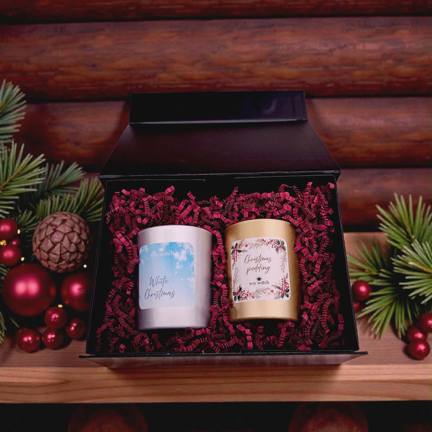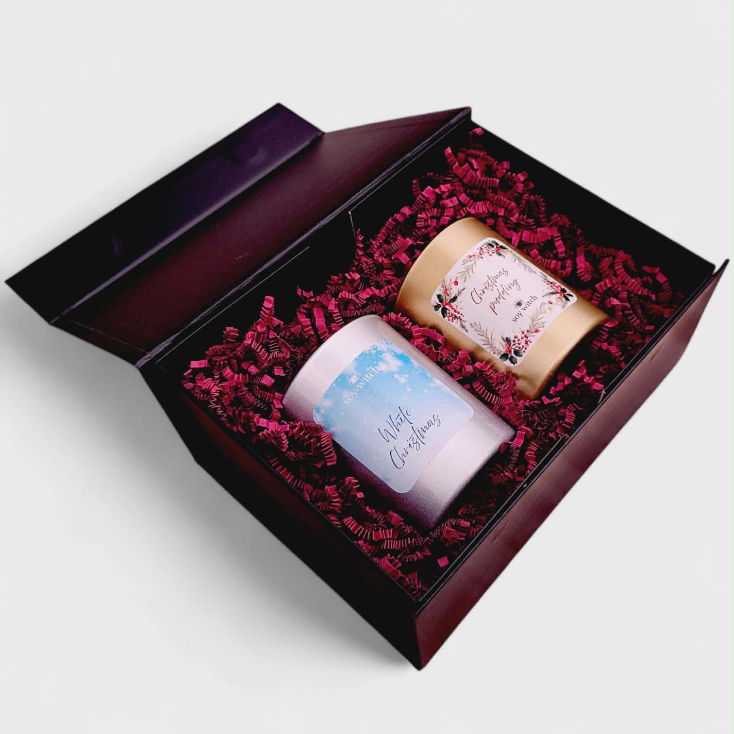 Podaruj sobie lub bliskim magię świąt zamkniętą w wyjątkowej, eleganckiej oprawie. Luksusowy zestaw dwóch świec o pojemności 280 ml, stworzonych z naturalnego wosku sojowego i zamkniętych w efektownym srebrnym oraz złotym szkle. Całość dopełnia stylowe, czarne pudełko z magnetycznym zamknięciem, które sprawia, że zestaw jest gotowy do wręczenia jako prezent.